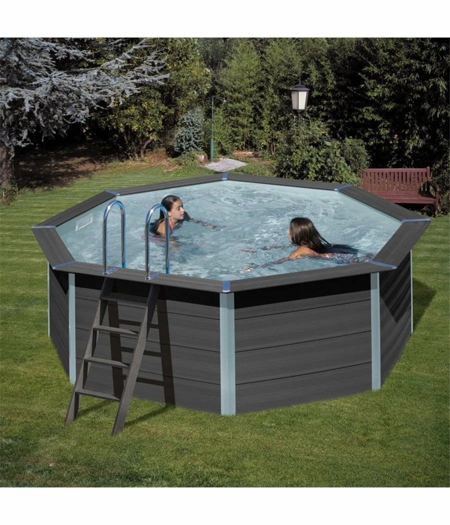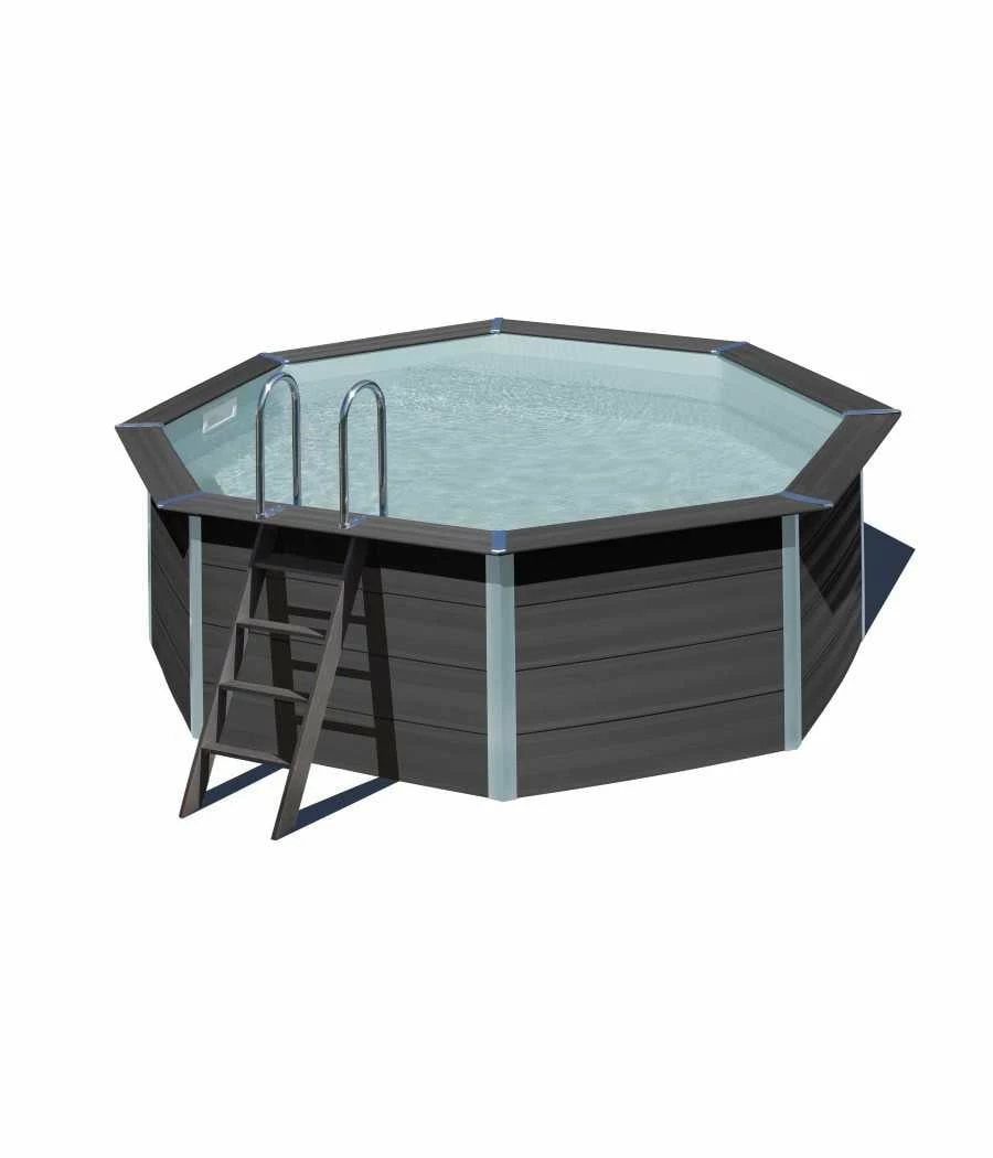 La gamme de piscines en composite GRE a un style avant-gardiste pas uniquement parce qu’elle est disponible sous différentes formes (octogonale, octogonale allongée, carrée, rectangle) mais surtout par la composition des matériaux de la structure de la piscine : un alliage de bois et de PVC.